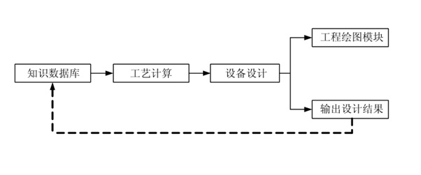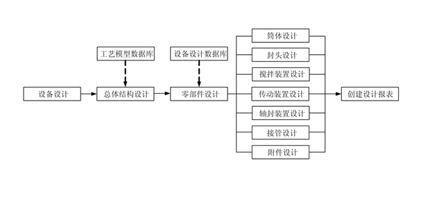 工藝計算后的設計方案作為設備設計的原始條件。首先從工藝模型數(shù)據(jù)庫中檢索確認和完成總體結構,再結合設備設計數(shù)據(jù)庫進行具體的零部件設計,主要的設計內(nèi)容包括: 筒體和封頭設計、攪拌裝置設計、傳動裝置設計、軸封裝置設計等。設計得到的結果保存到設計報表中,后續(xù) CAD 繪圖模塊從中讀取有關數(shù)據(jù),繪制或自動生成設備工程圖。具體流程如下圖: