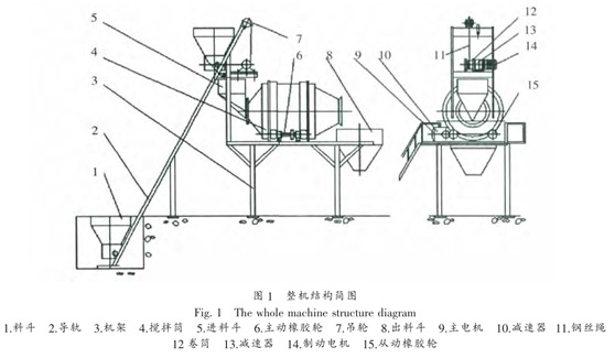 在攪拌筒內(nèi)焊裝有高葉片、 低葉片和出料葉片各一對, 高葉片、 低葉片分別與軸線成 37° 夾角, 反向。 工作時, 物料從攪拌筒進(jìn)料錐的一端進(jìn)入, 當(dāng)攪拌筒沿順時針方向旋轉(zhuǎn)時, 高葉片將部分物料提升到一定高度, 之后物料靠自重作用自由下落, 并與攪拌筒底部物料進(jìn)行混合。 這種混合是在反復(fù)提升與下落物料中完成的,高葉片還可把物料向出料方向推移, 而低葉片卻又把出料端的物料向進(jìn)料方向推移, 從而使物料產(chǎn)生較強(qiáng)烈的沖擊和一定的對流作用, 因此混合質(zhì)量較好。 當(dāng)攪拌筒逆時針方向旋轉(zhuǎn)時, 葉片將物料推向出料錐一端, 由兩條交叉成 180° 的出料葉片把成品物料卸出。
