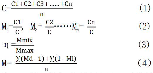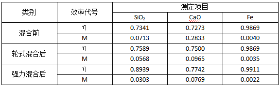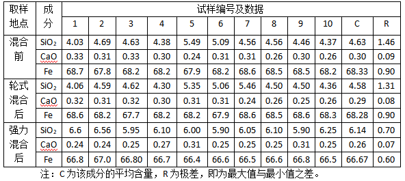 式中 C1……Cn為試樣某成分的含量,C為平均含量;n為試祥數(shù);M1……Mn為各試樣的均勻系數(shù);Mmix,Mmax為均勻系數(shù)的小值和大值;Md為大于1的試樣的均勻系數(shù),Mi為小于1的試樣的均勻系數(shù);M為平均均勻系數(shù),其數(shù)值愈接近0愈好;η為混合效率,其值愈接近1愈好。