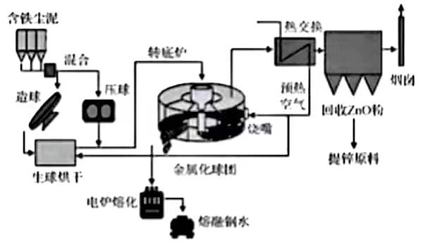 含鐵塵泥是鋼鐵生產(chǎn)過程中種類較為繁多的廢棄物,其成分復(fù)雜,含有鐵、鈣、鎂、碳等鋼鐵生產(chǎn)所需的元素,是非常有價值的二次資源。轉(zhuǎn)底爐直接還原工藝通過造球和壓球的方式將各種除塵灰、污泥制成球團(tuán),經(jīng)過烘干、預(yù)熱、焙燒還原、冷卻等工序生產(chǎn)、金屬化球團(tuán),用于電爐作為造渣劑或替代廢鋼使用;塵泥中的鋅在高溫下被還原成單質(zhì)鋅,揮發(fā)進(jìn)入煙氣,煙氣經(jīng)冷卻、除塵后得到副產(chǎn)品氧化鋅粉,用于進(jìn)一步提鋅,處理效果顯著。