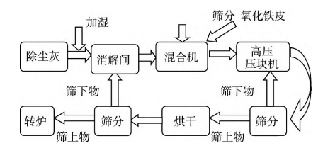 轉(zhuǎn)爐煉鋼過程中會(huì)產(chǎn)生大量煙塵,先經(jīng)過蒸發(fā)冷卻器將顆粒較粗的部分收集,剩余部分再經(jīng)過靜電除塵器收集,可以得到粒度細(xì)小且含鐵料高的轉(zhuǎn)爐除塵灰。為解決轉(zhuǎn)爐除塵灰內(nèi)部處置和資源化利用問題,將轉(zhuǎn)爐除塵灰壓成冷壓塊,烘干后返轉(zhuǎn)爐煉鋼循環(huán)利用,可以達(dá)到預(yù)期效果。